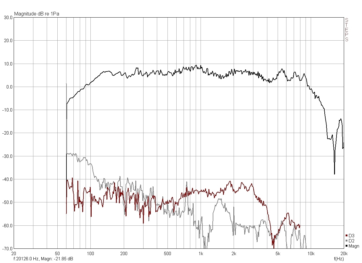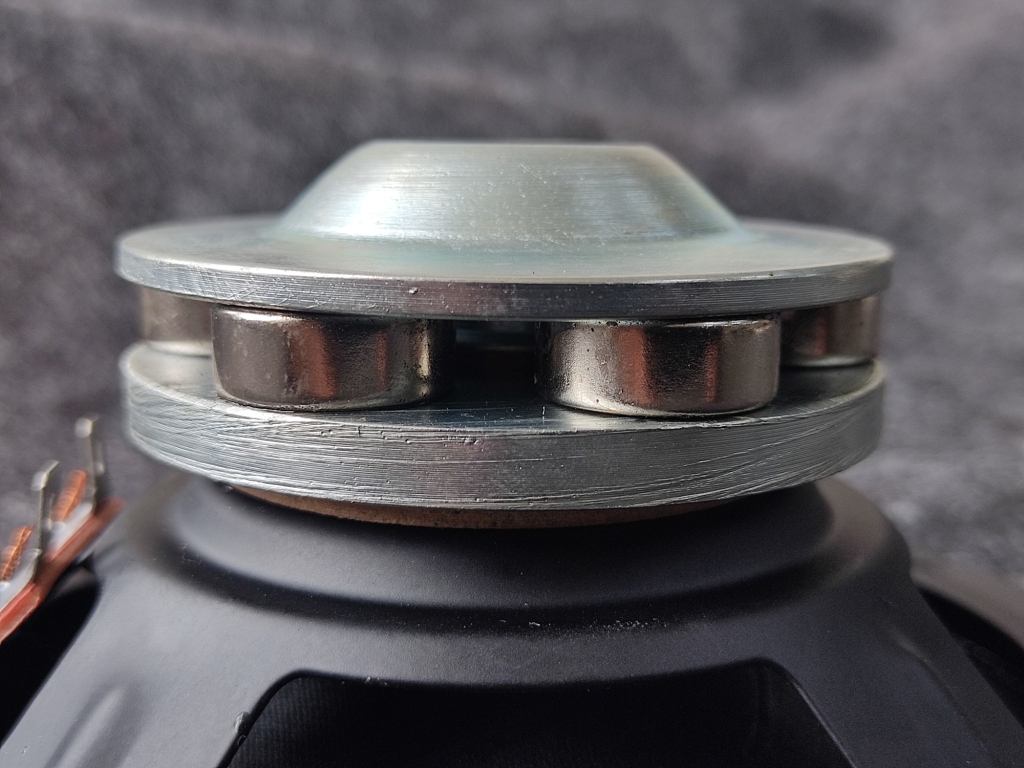 Среднечастотная динамическая головока с бумажным диффузором и разгруженнным подкупольным пространством. Вентилируемая магнитная система специальной формы с магнитами на основе неодима снижает компрессию в подколпачковом прстранстве и аэродинамические шумы . Существенно снижает нелинейные искажения.